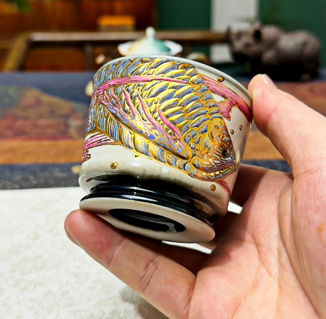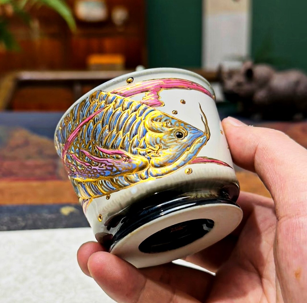 Inspired by imperial motifs, the cup features intricate golden designs—such as mythical dragons, phoenixes, or Goldfish pattern—that symbolize power, harmony, and prosperity. The gilded accents contrast beautifully with the porcelain’s milky-white base, creating a luminous effect reminiscent of “flowing light through jade” . The cup’s silhouette balances elegance and simplicity, with a flared rim and ergonomic handle designed for both aesthetic appeal and practical use.