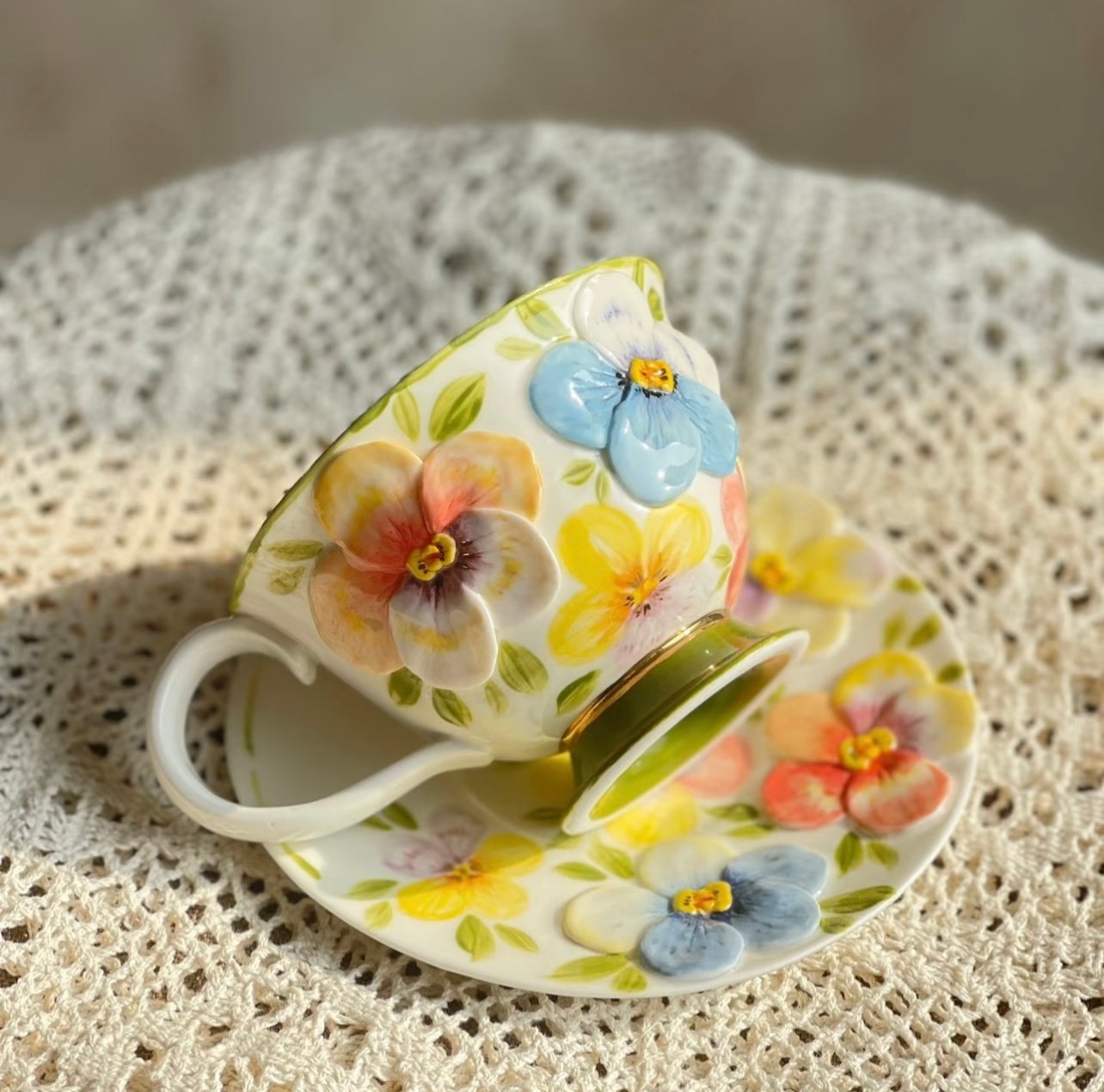 **”3D Pansy Artisan Tea Cup (Pre-Order) – Handcrafted Blooms Shipping in 3 Days”**